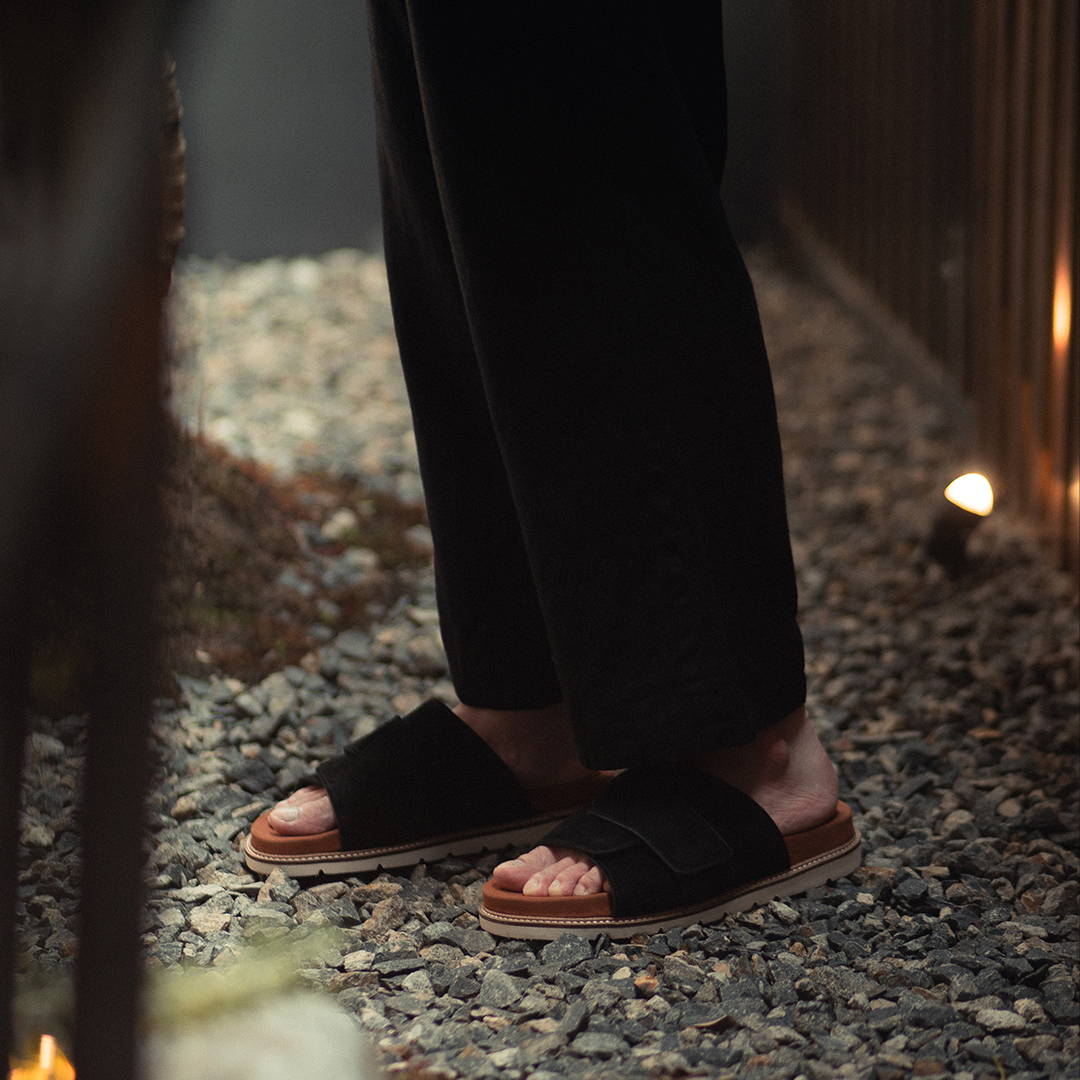 Built for easy wear with a unique yet minimal shape. LEIS Slides feature a wide suede leather upper that offers coverage and a relaxed fit. The lambskin insole delivers softness and comfort, while the lightweight EVA rubber outsole ensures flexibility and support. Designed for effortless on-and-off wear with a clean, modern look.